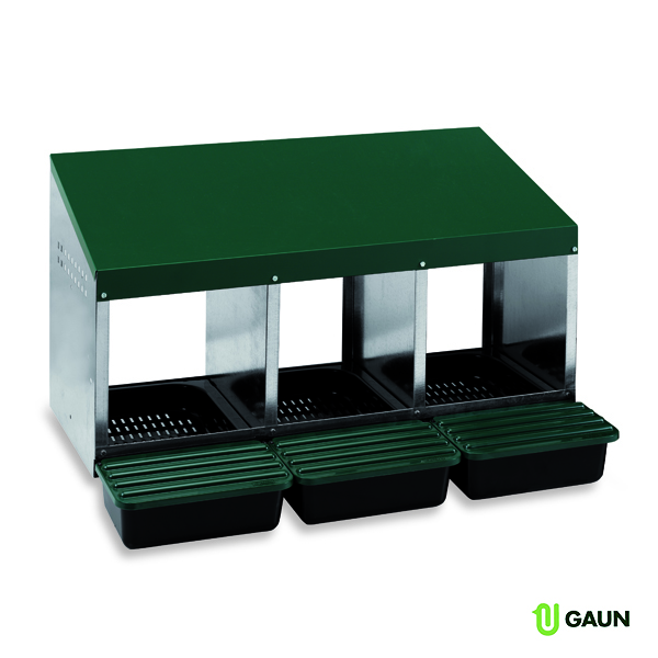 Gniazdo lęgowe marki Gaun z trzema komorami i plastikowym dnem zostało zaprojektowane z myślą o kurach i drobiu, zapewniając im wygodne i bezpieczne miejsce do znoszenia jaj. Lekko nachylone plastikowe dno umożliwia delikatne zsuwanie się jaj do oddzielnej plastikowej kuwety, co gwarantuje ich czystość i ochronę.